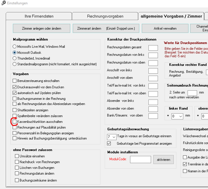 Es ist möglich das Kassenbuch zu deaktivieren, indem Sie bei „allgemeine Vorgaben / Zimmer“ die Option „Kassenbuchfunktion ausschalten“ anhaken.
